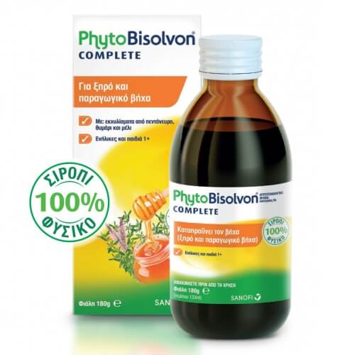 Το PhytoBisolvon Complete είναι ένα ιατροτεχνολογικό προϊόν που ενδείκνυται για τον βήχα (ξηρό και παραγωγικό βήχα) και, ιδίως, για τον βήχα που συνδέεται με λοιμώξεις των ανώτερων αναπνευστικών οδών. Ασκεί διπλή μηχανική δράση στον ερεθισμένο βλεννογόνο: ευνοεί την ενυδάτωση της βλέννης, διευκολύνοντας τη φυσιολογική της απομάκρυνση και δημιουργεί μια «μεμβράνη» που προστατεύει το βλεννογόνο από την επαφή με εξωτερικούς ερεθιστικούς παράγοντες