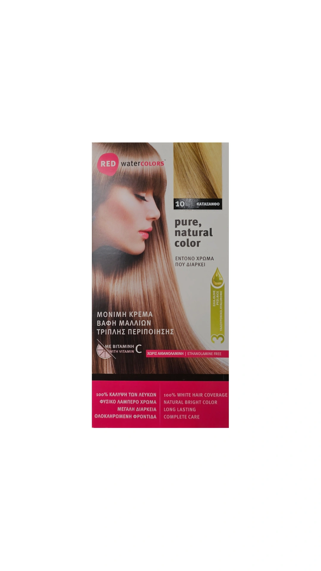 Η Red Water COLORS έχει σχεδιαστεί για να εξασφαλίσει το καλύτερο χρωματικό αποτέλεσμα και ταυτόχρονη φροντίδα στα μαλλιά σας.Η Μόνιμη Κρέμα Βαφής Μαλλιών, περιποιείται τα μαλλιά καθώς τα βάφει, χαρίζοντας πλούσιο και έντονο χρώμα, καλύπτοντας 100% τα λευκά.Το Σαμπουάν Σταθεροποίησης Χρώματος επαναφέρει τη φυσική ισορροπία των μαλλιών και προστατεύει το χρώμα μέχρι την επόμενη βαφή.Η Ενυδατική Μάσκα Επανόρθωσης ενυδατώνει, θρέφει και ολοκληρώνει τη φροντίδα των μαλλιών αφήνοντάς τα μαλακά, υγιή και λαμπερά.