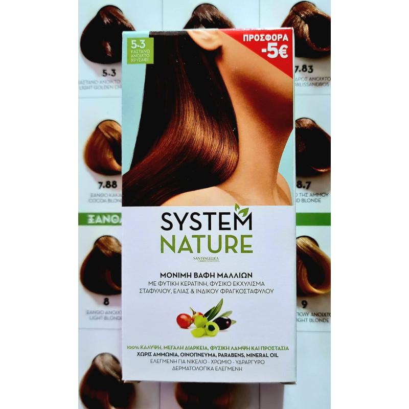 Η νέα μόνιμη βαφή μαλλιών SYSTEM NATURE, με Φυτική Κερατίνη, Φυσικό εκχύλισμα Σταφυλιού, Ελιάς και Ινδικού Φραγκοστάφυλου, χαρίζει 100% κάλυψη λευκών και γκρίζων μαλλιών, ομοιόμορφο χρώμα με μεγάλη διάρκεια, προστασία και φυσική λάμψη.