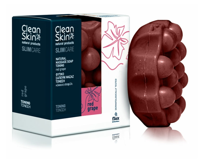 Το φυτικό σαπούνι τόνωσης CleanSkin @ SLIM CARE περιέχει κουκούτσια από κόκκινο σταφύλι, τα οποία απομακρύνουν τα νεκρά κύπαρα της επιδερμίδας, αφήνοντάς την απαλή και λεία.