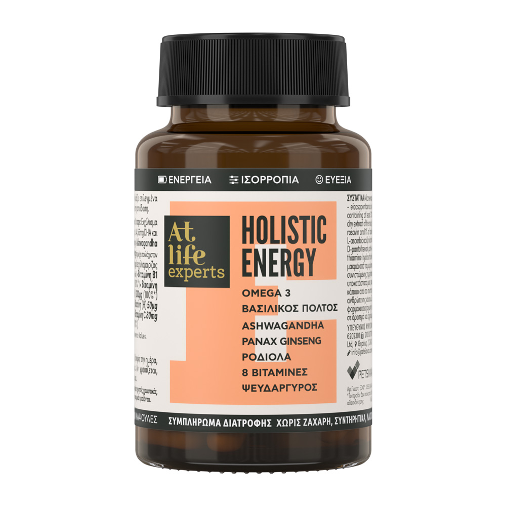 To AtLife experts Holistic Energy είναι ένα εξειδικευμένο ενεργειακό συμπλήρωμα διατροφής που περιέχει έναν καινοτόμο επιστημονικά μελετημένο συνδυασμό μοναδικών φυτικών συστατικών με Βασιλικό πολτό, εκχύλισμα Ashwagandha, εκχυλίσματα Panax Ginseng και Rhodiola, μαζί με Ωμέγα 3, 9 βιταμίνες και ιχνοστοιχεία, που προσφέρουν μία συνεργική δράση με πολλαπλά ευεργετικά αποτελέσματα για τον οργανισμό και μέγιστη απόδοση.